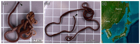 Kulikovia alborostrata (Takakura, 1898) live specimens and collection site. (a) Female, (b) male, (c) collection site (asterisk). The black arrowheads point to the head region of worms.