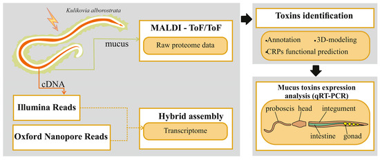 In this study, we investigated the protein and peptide toxin content in the transcriptome of the whole body and in the mucus of the pilidiophoran Kulikovia alborostrata, a nemertean species widely spread off the coasts of the Sea of Japan and the Yellow Sea, using a combined transcriptomic and proteomic approach. The expression levels of the selected CRPs with a putative toxic activity were evaluated in different parts of the body of the worm by quantitative real-time PCR (qRT-PCR). A distinctive feature of K. alborostrata, as well as other heteronemerteans, from other nemertean groups is the presence of an additional subepidermal glandular layer, called cutis [40]. The presence of additional glandular structures, resulting in the producing of high amounts of mucus, allowed heteronemerteans to successfully colonize a wide range of habitats [40]. Recent studies showed that cutis glands contain a variety of components, including proteinaceous [60] and non-proteinaceous toxins [29,63].