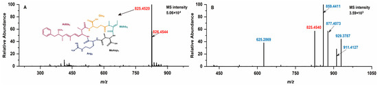 Following chlorination, NOD-R can metamorphose into a variety of prototypical NOD-R-DBPs, each with distinct molecular weights which are identifiable through mass spectrometry analysis (Figure 1). For NOD-R, with a molecular formula of C41H60N8O10, the primary mass spectrometry signals are detectable at m/z 825.4520 and 826.4544 (the main isotopic peak) (Figure 1A) [6]. New mass spectral signals of five freshly formed protonated prototypical NOD-R-DBPs were detected at m/z 625.2945, 859.4565, 877.4227, 929.3943, and 911.4281 for the disinfected samples (Figure 1B). With the assistance of Compass Isotope Pattern (Version 3.2) software, the chemical formulae of the above NOD-R-DBPs could be determined as C26H40N8O10 (-15C, -2OH), C41H62N8O12 (+2OH), C41H61N8O11Cl (+OH, +Cl), C41H62N8O12Cl2 (+2OH, +2Cl), and C41H63N8O13Cl (+3OH, +Cl).