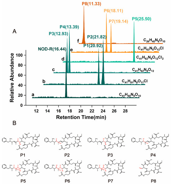 Extract ion chromatograms of native NOD-R and prototypical NOD-R-DBPs from disinfection sample (A). The structure of NOD-R-DBPs (P1–P8) (B). Conditions: P1–P8 represent oxidized Adda3, respectively.