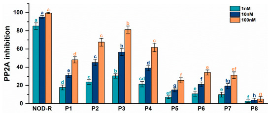 Inhibitory effects of NOD-R and prototypical NOD-R-DBPs on PP2A at different concentrations. The error bar is the standard error of three repeated analyses. Different letters indicate significant differences between groups (p < 0.05), obtained using IBM SPSS Statistics (version 26.0) software [22].