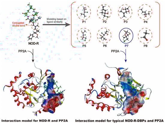 Since the interaction model of the NOD-R-DBPs–PP2A complex remains unsolved, a deeper understanding of the specific molecular mechanism by which NOD-R-DBPs may inhibit PP2A is limited. Since NOD-R and NOD-R-DBPs have certain structural similarities, the NOD-R–PP2A complex model was considered an ideal template for constructing the NOD-R-DBPs–PP2A complex interaction model. Through homologous modeling strategy [23], the interaction model of NOD-R-DBPs and PP2A complex was constructed (Figure 4). The NOD-R–PP1 model (PDB code 3E7A) was downloaded [24,25] and then modified by adding hydrogen atoms and charges. The models for NOD-R and PP2A can be built using homologous modeling, based on the modified NOD-R–PP1 model, where PP2A replaces the original PP1 protein in the modified model. Similarly, prototypical NOD-R-DBPs and PP2A models were constructed: the ligand NOD-R was substituted with the identified NOD-R-DBPs. The “template dock” mode was used to dock ligand molecules to the active site of a protein. Developed by Molecular Operating Environment software (MOE software, version 22.02), the “template dock” mode is suitable for binding sites where the location is known but specific ligand interaction information is lacking, ensuring the stability and accuracy of the structure [26,27,28]. This process identified 73 potential interaction parameters between NOD-R/NOD-R-DBPs and PP2A, indicating crucial binding sites (Table S3). Among the numerous potential interaction parameters, screening out key interaction parameters related to the toxicity of NOD-R/NOD-R-DBPs is crucial for elucidating the molecular mechanism by which NOD-R/NOD-R-DBPs inhibit PP2A, which is also our next task.