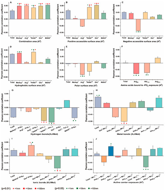Pearson correlation coefficient between potential interaction parameters and the inhibition data. (A) combination area, (B) positive accessible surface area, (C) negative accessible surface area, (D) hydrophobic surface area, (E) polar surface area, (F) amino acids bound to -PO4 exposure, (G) hydrogen bonds, (H) metal bonds, (I) ionic bonds, (J) active center exposure. Conditions: