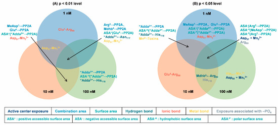 At multiple concentrations, data pairs with strong correlations with toxicity data are more important for analyzing mechanisms. To identify key interaction parameters amidst the diverse range of correlations, Venn diagrams were employed (Figure 6). Venn diagrams can help us understand the correlation between parameters more intuitively, making it easier to screen and confirm parameters with stronger correlations [33,34]. At a significance level of p < 0.01, five interaction parameters had extremely significant correlations with the inhibition data at three toxin concentrations (for example, hydrogen bond for “Adda3” ← Asn117). Five parameters have shown extremely significant correlation with inhibition data at two toxin concentrations (such as the positive accessible surface area for “Adda3” → PP2A). Four parameters had extremely significant correlations with inhibition data at one toxin concentration (for example, ionic bond Glu4-Arg89). At a significance level of p < 0.05, five interaction parameters have shown extremely significant correlation with inhibition data across three toxin concentrations (for example, the negative accessible surface area for Arg2 → PP2A). Six parameters had extremely significant correlations with inhibition data at two toxin concentrations (such as hydrogen bond for “Adda3” ← His118 and the exposure area of amino acid His118 bound to -PO4). Eight parameters have shown extremely significant correlation with inhibition data at one toxin concentration (such as the combination area for MeAsp1 → PP2A, ionic bond Glu4-Arg89,and the catalytic center exposure area for Asp85 + Mn12+). Evidently, the aforementioned interaction parameters, particularly those correlated with inhibition data, are instrumental in elucidating the molecular mechanism underlying the potential inhibitory effects of NOD-R-DBPs on PP2A.