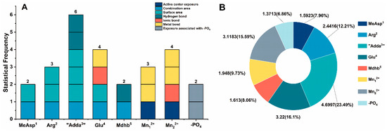 Histogram of the frequency of crucial interaction sites (A) and pie chart of the total || values of crucial interaction sites (B). Conditions: is the average Pearson correlation under three toxin concentrations.