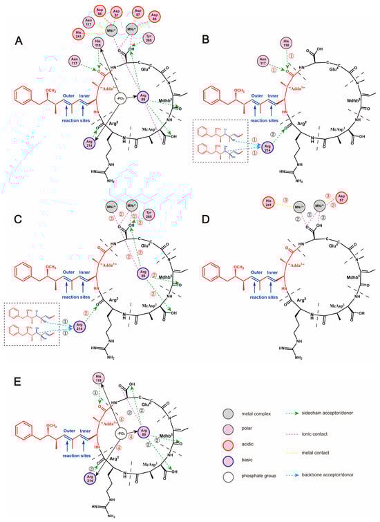 The 2D ligand-receptor interaction diagram for the combination of the toxins to PP2A. The interaction between NOD-R and PP2A (A). The interaction between toxins and PP2A that is directly affected by the damaged “Adda3” (B-➀). The interaction between toxins and PP2A that is indirectly affected by the damaged “Adda3” (C-➁). Influenced interactions related to Mn2+ ions (D-➂). Effect on the exposure of amino acids bound to phosphate group (E-➃).