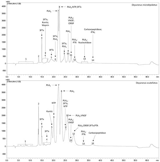 The lyophilized venoms of O. microlepidotus and O. scutellatus (3 mg each), provided by Venom Supplies (Tanunda, SA) were resuspended in 0.1% Trifluoroacetic Acid (TFA) and centrifuged (10,000× g) for 10 min, at 4 °C. The supernatant was then fractionated by reversed-phase high-performance liquid chromatography (RP-HPLC) in a Shimadzu Prominence binary system (Shimadzu, Kyoto, Japan), coupled to a C18 analytical column (250 mm × 4.6 mm, 5 m). UV detection was performed (SPDM 20A, Shimadzu, λ = 214 nm) and separation was achieved by a linear gradient of 20–100% solvent B (90% acetonitrile, containing 0.1% TFA) over A (0.1% TFA) for 50 min at a constant flow of 1mL·min−1. The use of this strategy aimed to enhance the resolution for fractionation, and later proteomic analysis, thereby enabling more precise identification and characterization of the venom constituents.