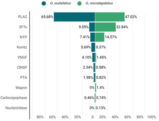 As observed with PLA2, a greater diversity of 3FTx was identified in the venom of O. microlepidotus, accounting approximately 33% of the identified proteins (Figure 2), compared to about 9% of the identified protein composition in O. scutellatus venom (Figure 2).