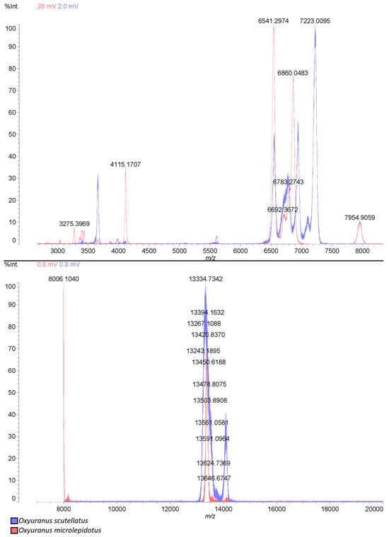 MALDI-TOF spectra from the venoms of Oxyuranus scutellatus (blue) and Oxyuranus microlepidotus (red).