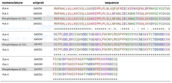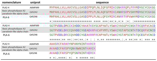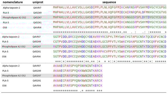 Both studies species presented Taipoxin (P00614; P0CG57; P00615; P00616) and Paradoxin (Q45Z46) in their venoms—two isoforms belonging to the PLA2 class—which are considered the main toxins responsible for the effects observed during envenomation by these snakes [22,23,24,25,26,27,28,29,30,31,32,33,34,35,36,37]. Taipoxin and Paradoxin are PLA2 of approximately 46 kDa, composed of a complex formed by three subunits: the alpha subunit, responsible for the neurotoxic action; and the beta and gamma subunits, which, although not directly active, enhance the neurotoxicity of the alpha subunit [37,38,39]. Although the alpha subunit of paradoxin was not identified in any of the venoms analyzed, two homologous proteins (A6MFM9; Q45Z48) were detected in the venom of O. scutellatus, with their sequence alignments presented in Figure 5. The gamma subunit of this toxin has not yet been sequenced.