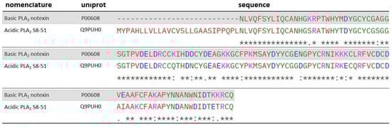 Some PLA2s identified in this study have not yet been functionally described in the literature; however, they share significant homology with well-characterized proteins. An example is PLA2 S8-51 (Q9PUH0), a protein which exhibits high sequence similarity to notexin (P00608), as shown in the alignment presented in Figure 8. Notexin, originally isolated from the venom of Notechis scutatus scutatus, displays typical phospholipase activity, catalyzing the hydrolysis of phospholipids in muscle or neuronal cell membranes and inhibiting acetylcholine-mediated neurotransmission. Additionally, it has been shown to exert marked nephrotoxic effects in mice following subcutaneous administration, causing glomerular and tubular damage [48,49].