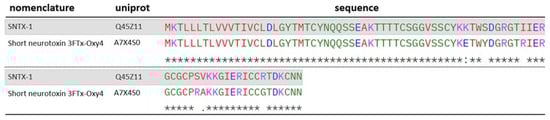 The toxin SNTX-1 (Q45Z11) found in the venom of O. scutellatus was described by Zamudio et al. [52]. According to the authors, this toxin exhibits a high inhibitory capacity on skeletal muscle AChRs, with an IC50 of 2.4 ± 0.4 nM. In contrast, it does not display the same affinity for brain AChRs, suggesting a postsynaptic site of action. The authors also described SNTX-2 (P0CB06), identified in the venom of both snake species. This 3FTx exhibits a mode of action similar to that of SNTX-1. Although SNTX-1 itself was not identified in the venom of O. microlepidotus, a homologous protein, named 3FTx-Oxy4 (A7X4S0) was detected. The sequence alignment is shown in Figure 9.