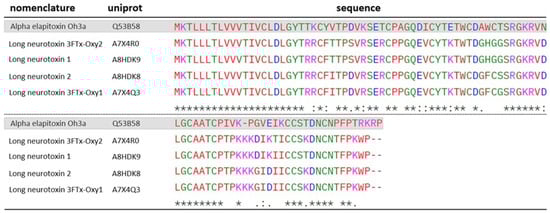 Three proteins identified in the venom of O. microlepidotus (A7X4R0; A8HDK8; A7X4Q3) and one protein identified in the venom of O. scutellatus (A8HDK9) show sequence homology to a well-characterized 3FTx, Elapitoxin-Oh3a (Q53B58). The alignment of these sequences is presented in Figure 10. This toxin was shown to induce blockade of nerve stimulation in the biventer cervicis muscle of chickens when challenged with endogenous acetylcholine and carbachol (CCh), both of which activate muscarinic and nicotinic receptors [53]. The authors also suggested a pseudo-irreversible antagonistic effect of this toxin based on a concentration-dependent, non-parallel rightward shift in the cumulative concentration-response to CCh, accompanied by a reduction in the maximal response in unstimulated chick muscle. However, this effect was not observed upon stimulation with KCl, further supporting a postsynaptic site of action for this toxin.