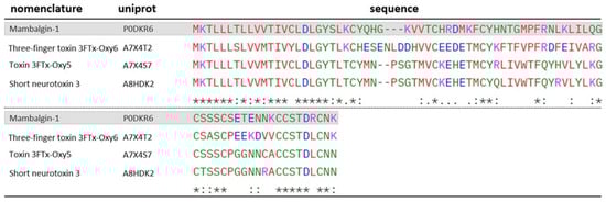 3FTx possess particularly relevant characteristics for studies targeting molecular mechanisms related to pain modulation. A series of 3FTxs with inhibitory action on acid-sensing ion channels (ASICs) has been characterized from the venom of the snake Dendroaspis polylepis, resulting in analgesic effects comparable to those of morphine [54]. Interestingly, some proteins identified in the venom of O. microlepidotus show a degree of sequence homology with one of the characterized 3FTx, mambalgin-1 (P0DKR6). The alignment of these sequences is presented in Figure 11.
