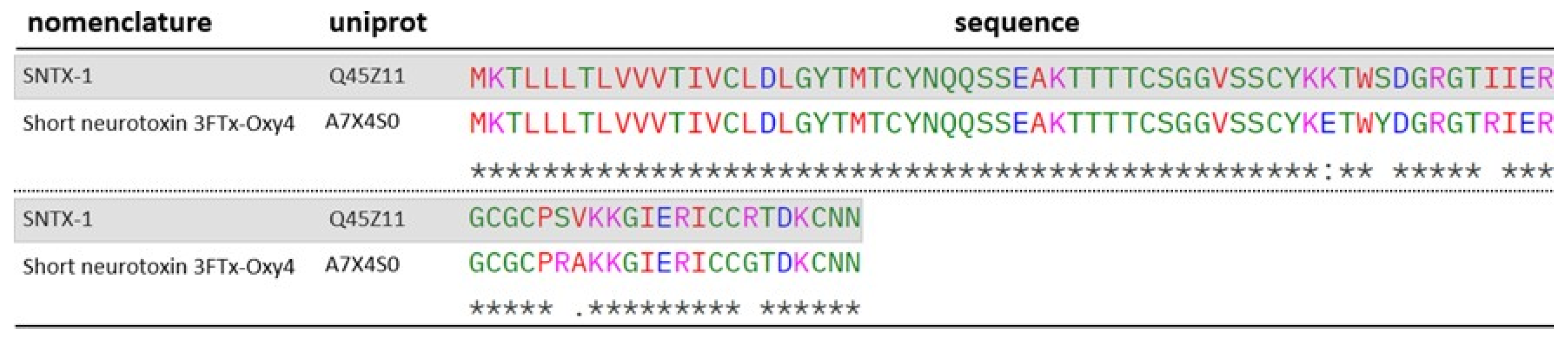 - Hiremath, K.; Dodakallanavar, J.; Sampat, G.H.; Patil, V.S.; Harish, D.R.; Chavan, R.; Hegde, H.V.; Roy, S. Three finger toxins of elapids: Structure, function, clinical applications and its inhibitors. Mol. Divers. 2024, 28, 3409–3426. [Google Scholar] [CrossRef] [PubMed]