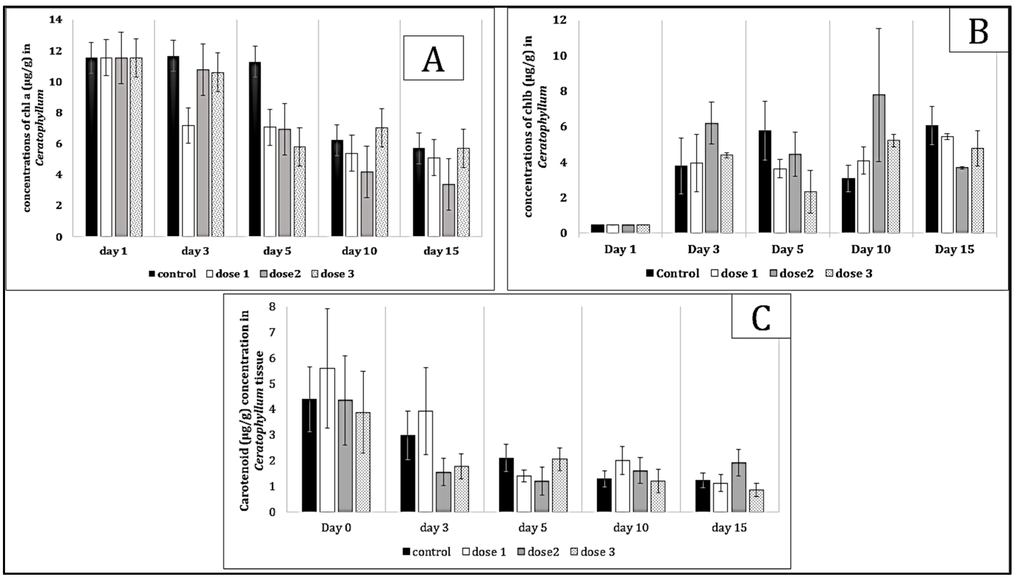 2.2. Effects on Chlorophyll a, b, and Carotenoids