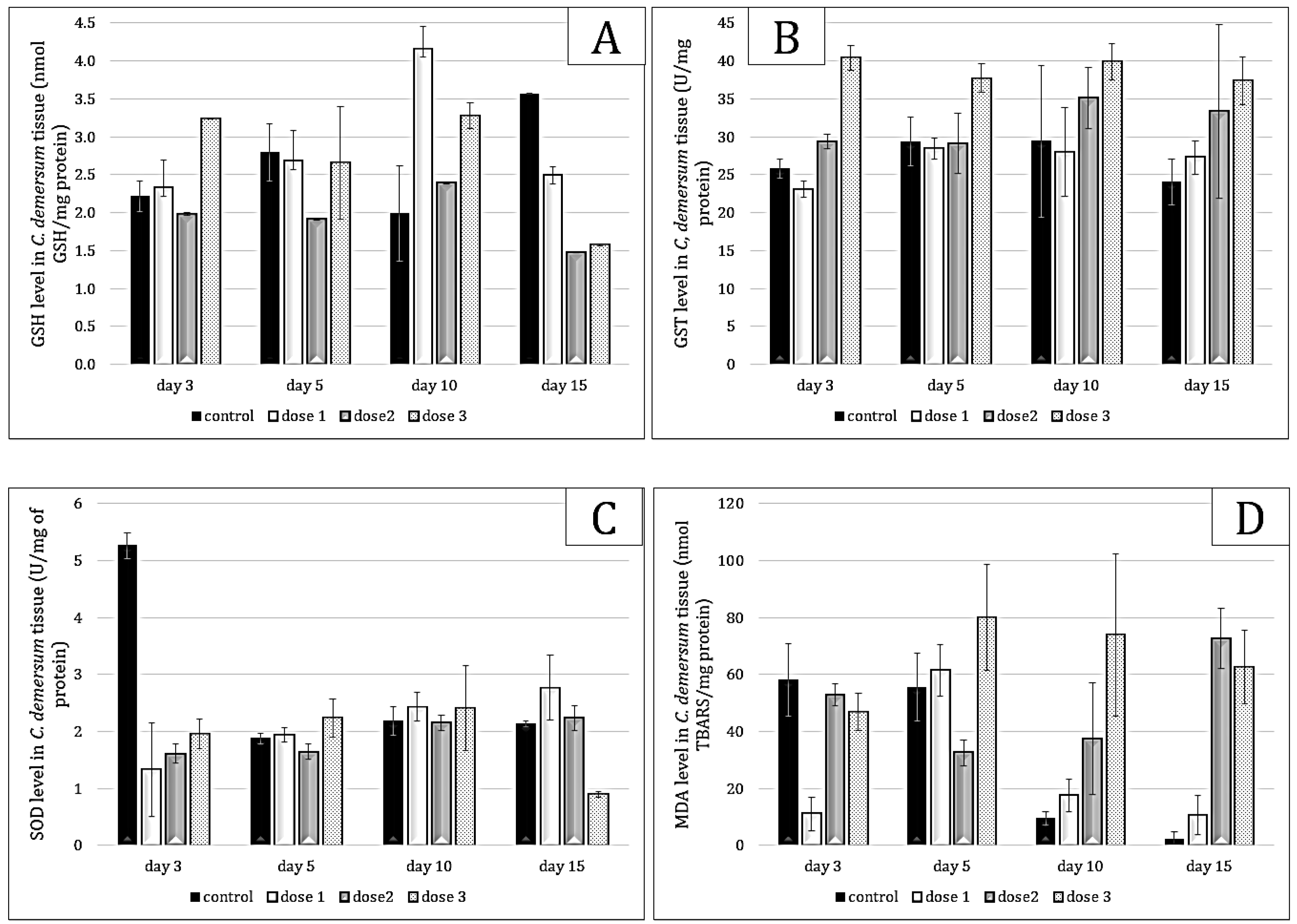 - Pflugmacher, S. Antioxidant responses in Ceratophyllum demersum exposed to microcystins. J. Plant Physiol. 2004, 161, 134–146. [Google Scholar]