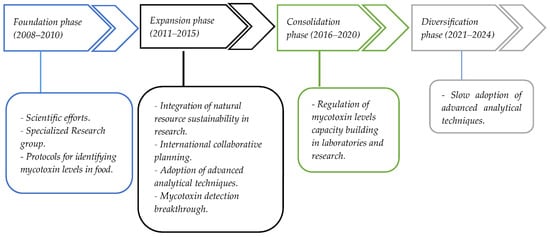 In recent years, Algerian researchers have increasingly focused on understanding, reducing, and managing mycotoxin contamination in agricultural commodities, particularly staple crops such as cereals and nuts. The evolution of the national response to mycotoxin contamination can be categorized into four distinct phases (Figure 2): (i) Foundation phase (2008–2010), (ii) Expansion phase (2011–2015), (iii) Consolidation phase (2016–2020), and (iv) Diversification phase (2021–2024).
