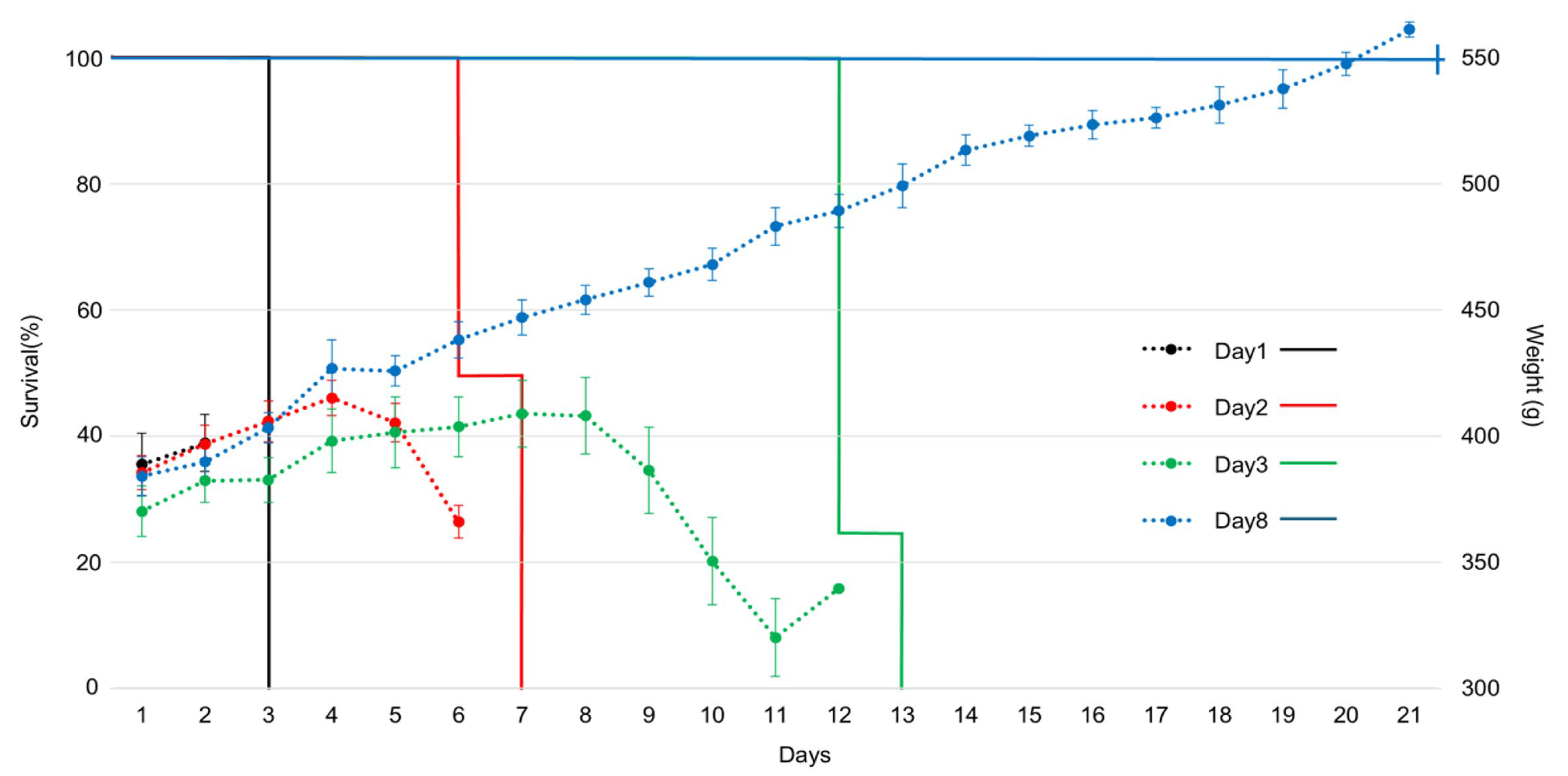 Survival/Number of Guinea Pig | 0/4 | 0/4 | 0/4 | 4/4 | 4/4 | 4/4 | |||||