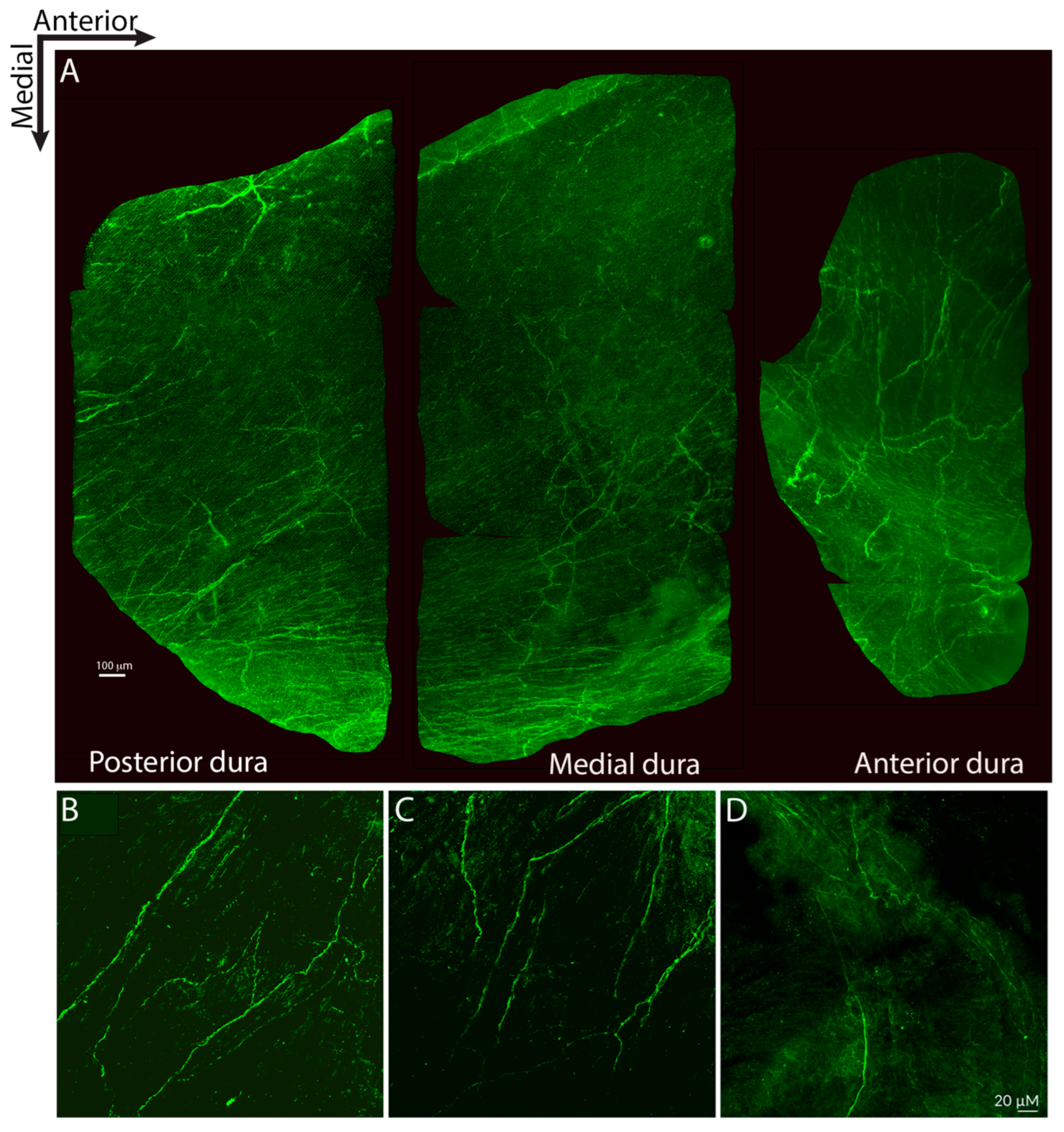 - Noseda, R.; Melo-Carrillo, A.; Nir, R.R.; Strassman, A.M.; Burstein, R. Non-Trigeminal Nociceptive Innervation of the Posterior Dura: Implications to Occipital Headache. J. Neurosci. 2019, 39, 1867–1880. [Google Scholar] [CrossRef]