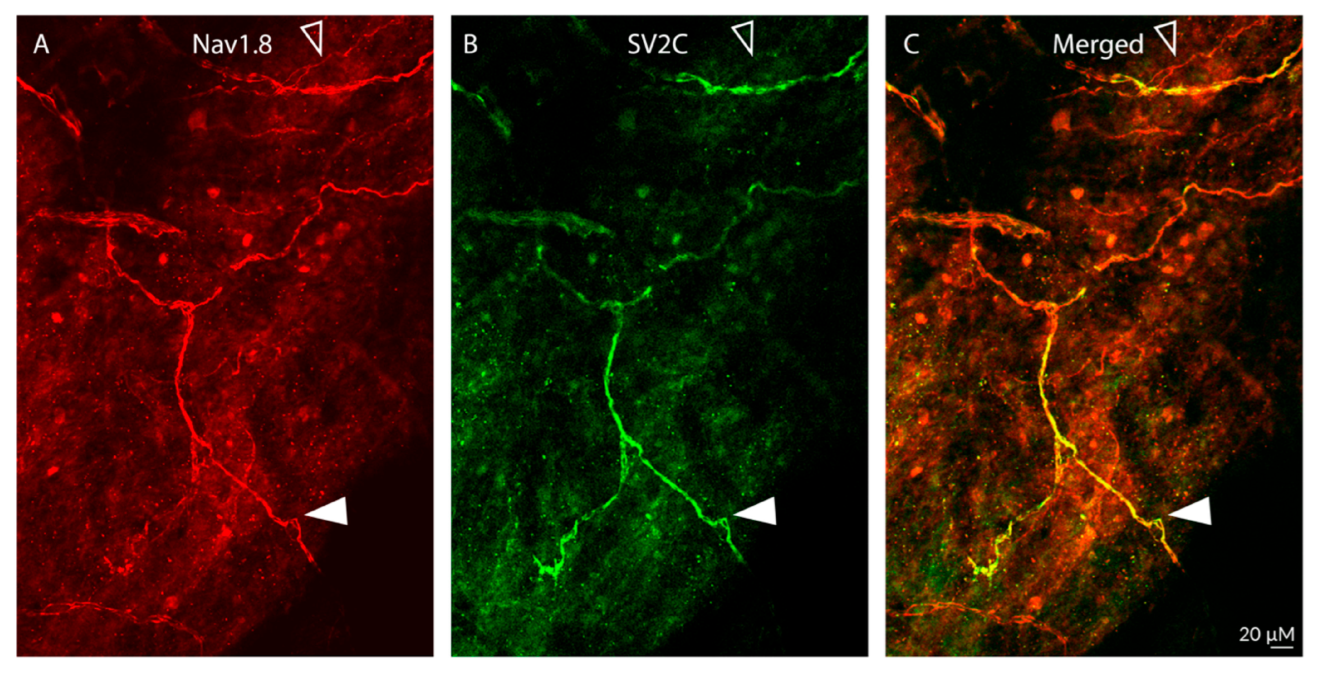 - Distribution of SV2C/NaV1.8-LIR fibers (Figure 8):