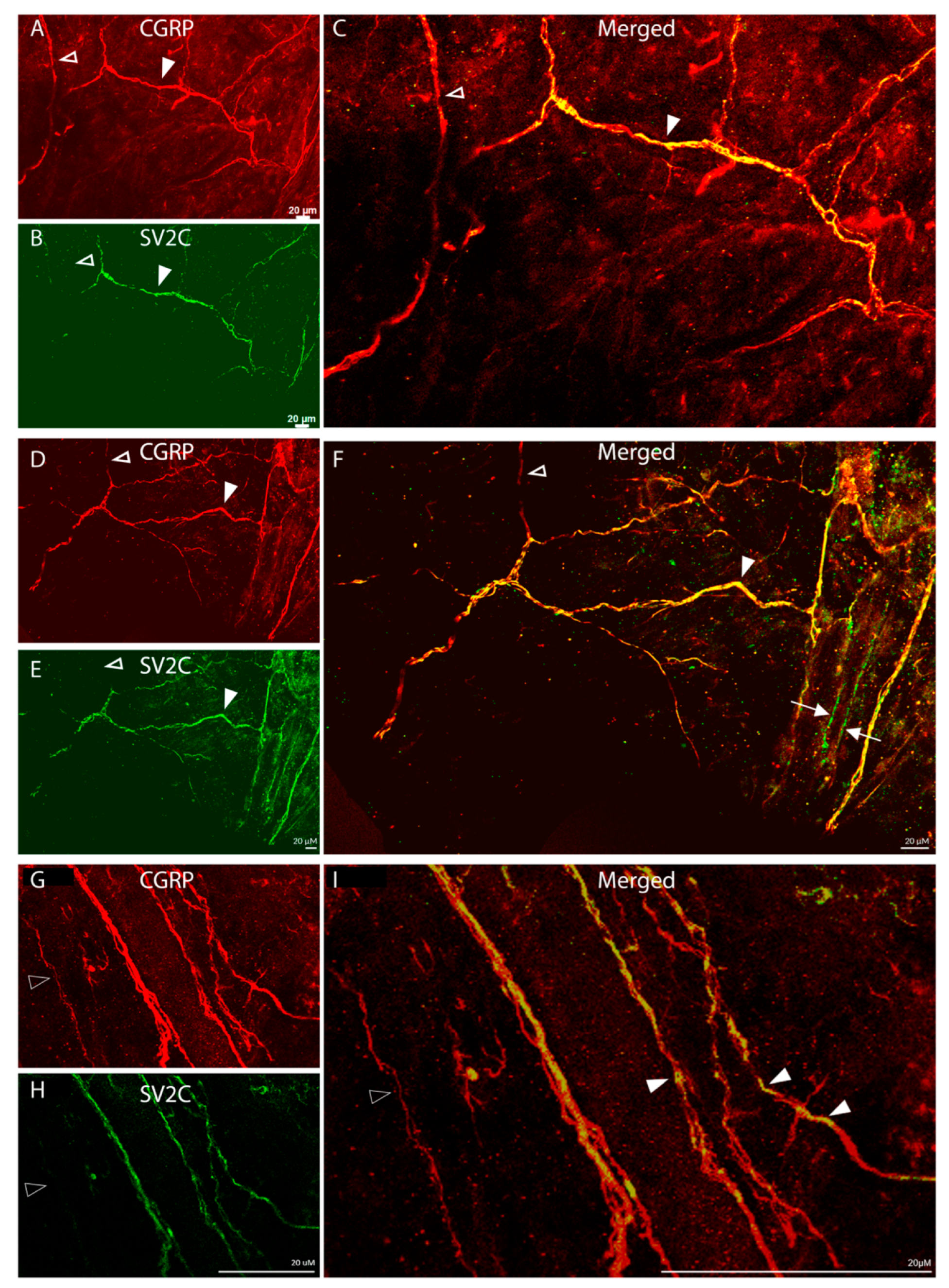 - Eftekhari, S.; Warfvinge, K.; Blixt, F.W.; Edvinsson, L. Differentiation of nerve fibers storing CGRP and CGRP receptors in the peripheral trigeminovascular system. J. Pain 2013, 14, 1289–1303. [Google Scholar] [CrossRef] [PubMed]