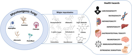 Mycotoxins, secondary metabolites produced by filamentous fungi, are widely recognized as unavoidable food and feed contaminants. They pose significant chronic dietary risks and can lead to toxicity syndromes known as mycotoxicoses upon ingestion [1,8,9]. Mycotoxins exhibit a broad range of adverse health effects, including carcinogenicity, mutagenicity, estrogenic disruption, nephrotoxicity, neurotoxicity, hepatotoxicity, immunosuppression, and gastrointestinal toxicity, with many displaying overlapping toxicities (Figure 1) [10,11,12,13].