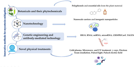 In addition to conventional methods for mycotoxin control, a variety of innovative approaches have gained increasing attention due to their potential to effectively reduce mycotoxin contamination, without leaving toxic residues or compromising product quality. These novel and promising strategies, which are still under development, include the use of botanicals and phytochemicals, nanotechnology, genetic engineering and antibody-mediated technology, as well as emerging non-thermal processing (Figure 3) [20,21].