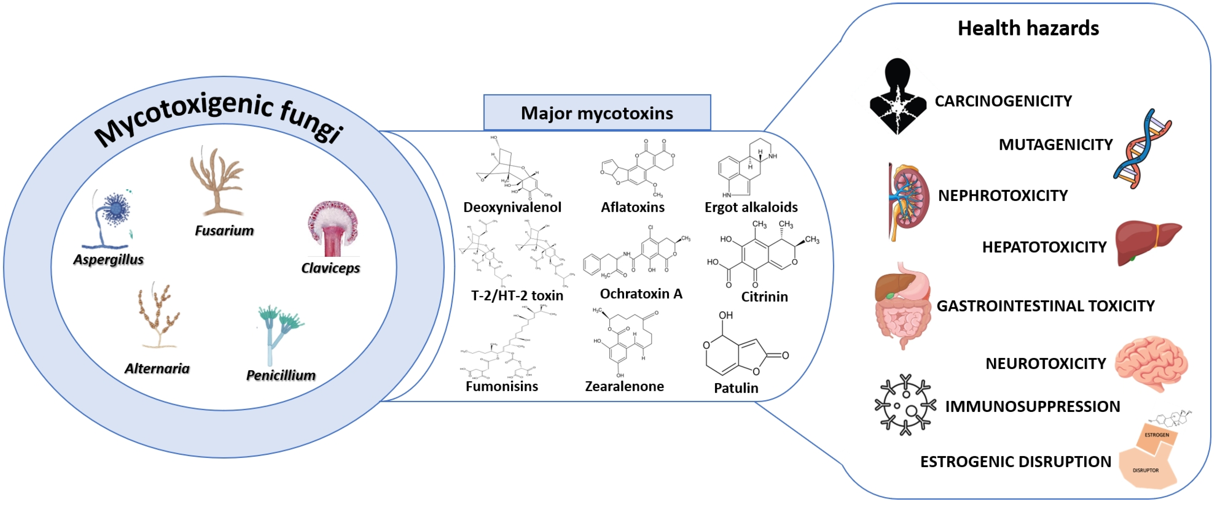 - Khan, R.; Anwar, F.; Ghazali, F.M. A comprehensive review of mycotoxins: Toxicology, detection, and effective mitigation approaches. Heliyon 2024, 10, e17488. [Google Scholar] [CrossRef]