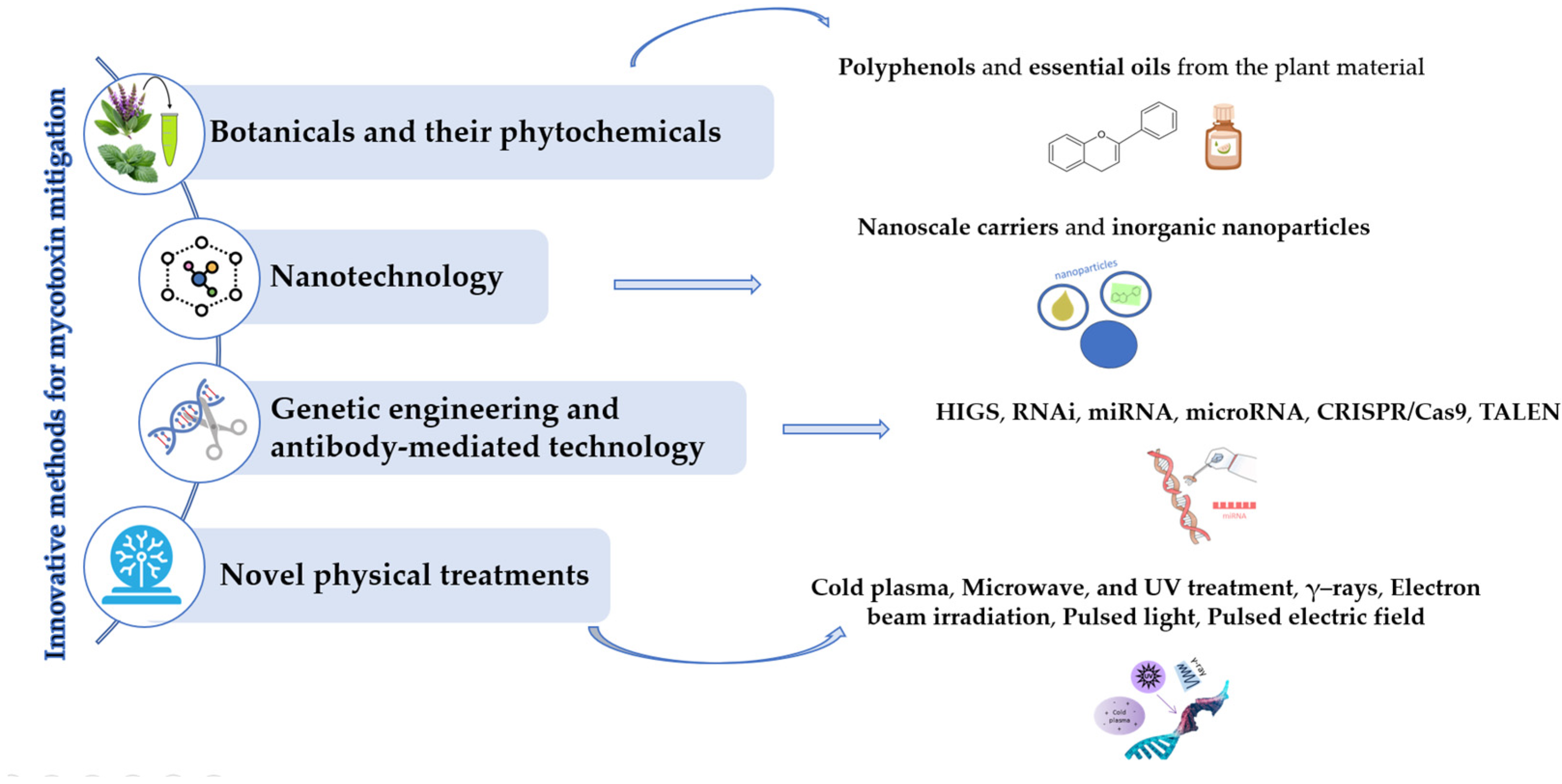 - Hamad, G.M.; Mehany, T.; Simal-Gandara, J.; Abou-Alella, S.; Esua, O.J.; Abdel-Wahhab, M.A.; Hafez, E.E. A review of recent innovative strategies for controlling mycotoxins in foods. Food Control 2023, 144, 109262. [Google Scholar] [CrossRef]