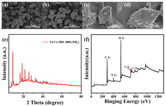 (a–d) SEM images, (e) PXRD pattern, and (f) XPS spectra of Fe/Co-MIL-88B(NH2). The pattern and spectra are shown for qualitative observation; no quantitative values are implied.