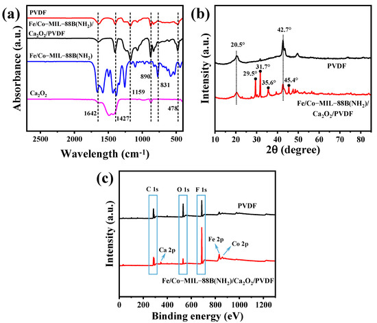 The functional groups present in different membranes were examined using FT-IR spectroscopy. As shown in Figure 3a, the Fe/Co-MIL-88B(NH2)/CaO2/PVDF composite membrane displays two peaks at 1642 cm−1 and 1427 cm−1, corresponding to the asymmetric and symmetric vibrations of coordinated carboxyl groups, respectively, indicating successful coordination of the organic ligands with metal centers. The peak at 831 cm−1 corresponds to the out-of-plane bending vibration of aromatic C-H in organic ligands, while the low-frequency peak at 478 cm−1 is assigned to Fe-O vibrations, confirming the presence of Fe-carboxylate coordination in the MOF structure. These spectral features are consistent with the structural characteristics of MIL-88B [38]. Additionally, the absorption bands 1159 cm−1 at and 890 cm−1 are attributed to the C-F stretching vibration in the PVDF matrix and the presence of Ca2+ binding, respectively [39,40], further confirming the fabrication of composite membrane.