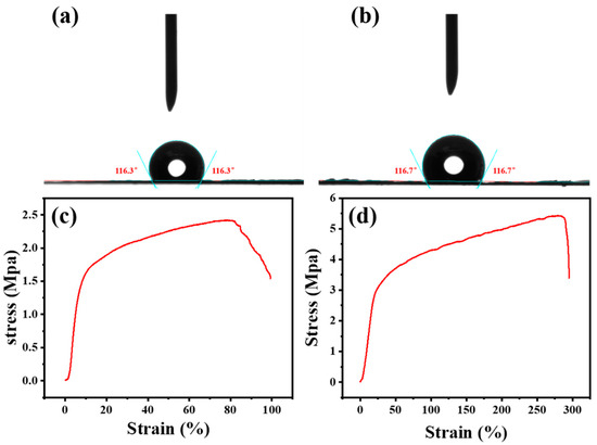 The static contact angles of (a) the PVDF membrane and (b) the Fe/Co-MIL-88B(NH2)/CaO2/PVDF composite membrane. The stress–strain measurements of (c) the PVDF membrane and (d) the Fe/Co-MIL-88B(NH2)/CaO2/PVDF composite membrane.