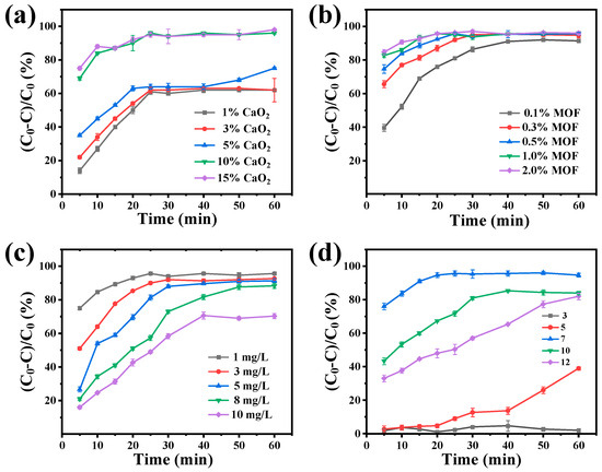 The degradation rate of the Fe/Co-MIL-88B(NH2)/CaO2/PVDF composite membrane toward AFB1 with different (a) CaO2 content, (b) Fe/Co-MIL-88B(NH2) content, (c) AFB1 concentration, and (d) pH values.