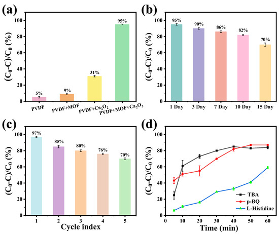 AFB1 degradation changes in different (a) membrane compositions (MOF stands for Fe/Co-MIL-88B(NH2)), (b) Fe/Co-MIL-88B(NH2)/CaO2/PVDF stability testing, and (c) Fe/Co-MIL-88B(NH2)/CaO2/PVDF cyclable test. (d) Degradation rate under different quencher agents.