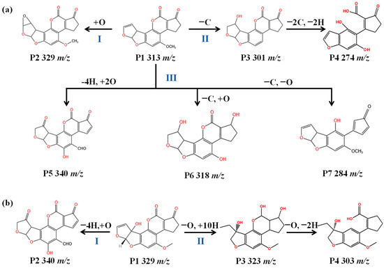 The degradation products of AFB1 are analyzed via LC-MS/MS, revealing that the degradation of AFB1 is primarily attributed to alterations in its furan ring and methoxy group. The LC-MS/MS results indicate three distinct degradation pathways. As shown in Figure 7a, Pathway I involves the conversion of P1 AFB1 (313 m/z) to P2 (329 m/z) through epoxidation of terminal double bonds. Pathway II undergoes hydroxylation and structural modification to generate P3 (m/z 301). Subsequently, functional group cleavage combined with additional hydroxylation leads to the formation of P4 (m/z 274) [46]. Pathway III begins with the formation of P5 (m/z 340) from P1 through oxygen addition to the terminal furan ring and the benzene ring. Subsequent double-bond addition on the furan ring and demethylation of the benzene ring side chain generate P6 (m/z 318). Finally, the loss of CO results in the formation of P7 (m/z 284) [47].