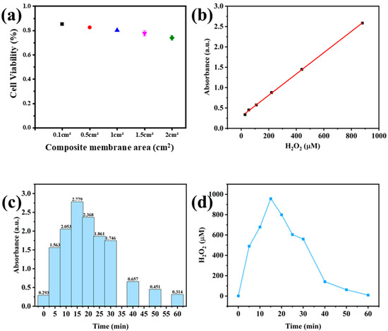 (a) HepG2 cell survival after incubation with different membrane areas. (b) The linear relationship of H2O2 concentration and UV-Vis absorption intensity. (c) The absorbance of the solution at 352 nm at different times and (d) the calculated hydrogen peroxide concentration at different times.