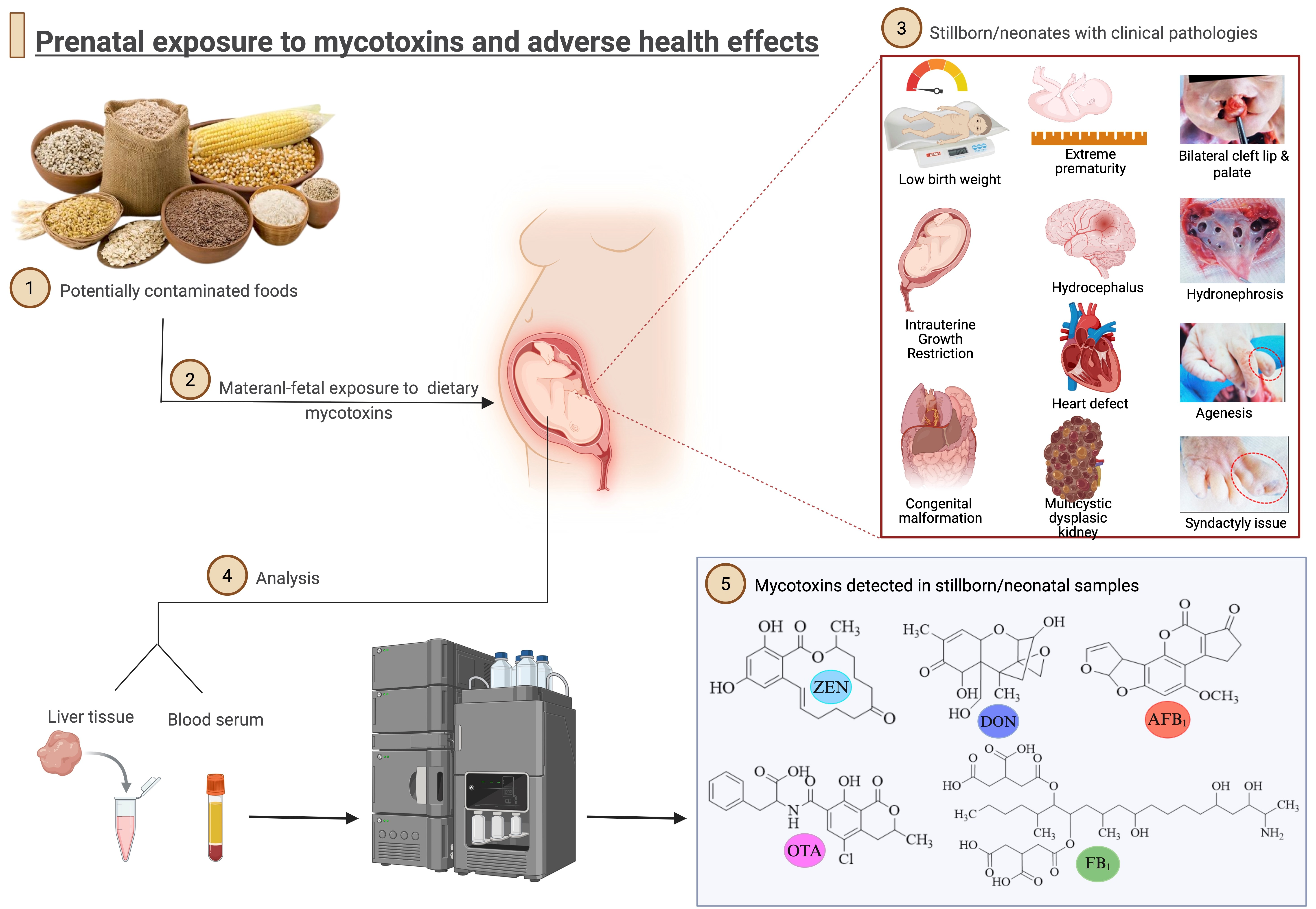 - Kyei, N.N.A.; Waid, J.L.; Ali, N.; Cramer, B.; Humpf, H.-U.; Gabrysch, S. Maternal Exposure to Multiple Mycotoxins and Adverse Pregnancy Outcomes: A Prospective Cohort Study in Rural Bangladesh. Arch. Toxicol. 2023, 97, 1795–1812. [Google Scholar] [CrossRef] [PubMed]