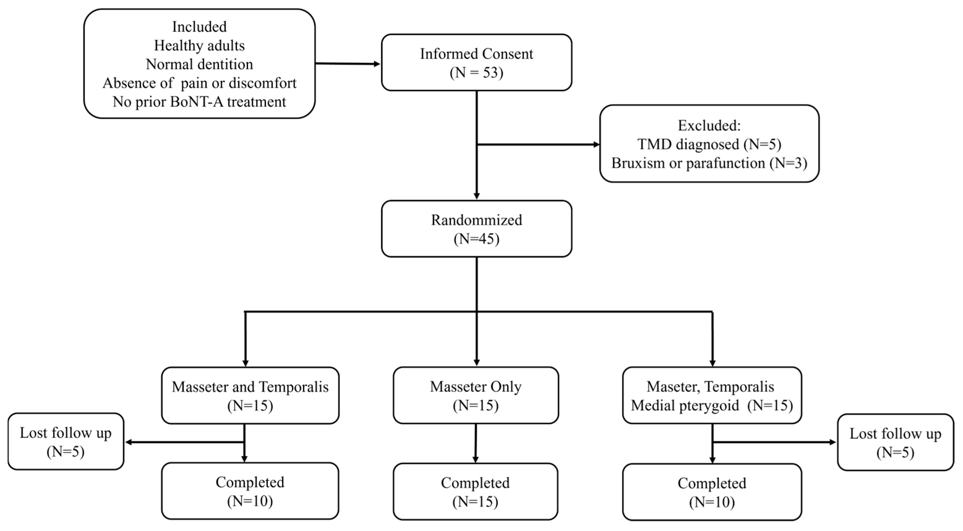 - de Souza Nobre, B.B.; de Oliveira Resende Machado, L.; Poluha, R.L.; Câmara-Souza, M.B.; Carbone, A.C.; de Almeida, A.M.; Grigoriadis, A.; Kumar, A.; De la Torre Canales, G. Temporalis Muscle Changes Following Botulinum Toxin A Injections in Masseter Hypertrophy Patients: A Randomized Triple-Blinded Trial. Aesthet. Plast. Surg. 2024, 48, 3979–3987. [Google Scholar] [CrossRef]