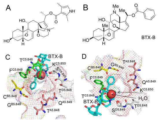 Multiple studies addressed the mechanism of BTX action at the location of its binding site. In earlier studies, BTX was proposed to bind between the lipid membrane and the channel and allosterically activate it. Ging-Kuo Wang and coauthors demonstrated that BTX-sensing residues are located in all the four S6 helices [15,16,17,18], implying that BTX binds inside the pore, and raising a question why the bulky toxin does not block the current. The question was addressed in a homology model of a BTX-bound sodium channel Nav1.4 [19] based on the crystal structure of open prokaryotic potassium channel MthK [20]. In this model, the sodium ion was proposed to move between oxygen atoms of BTX and the pore-lining channel residues. The model directed mutational studies of the Nav1.4 channel, which revealed three pore-facing residues whose lysine substitutions affected the BTX action [21,22,23]. A study of a cockroach sodium channel identified three additional residues whose alanine substitutions decreased the BTX action [24]. Intriguingly, BTX was also shown to modify homotetrameric prokaryotic sodium channels NaChBac and NavSp1, and mutations of the pore-facing residues in these channels affected the BTX action [25].