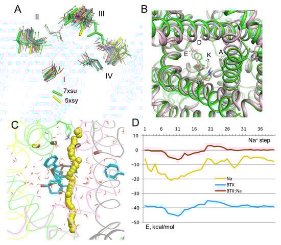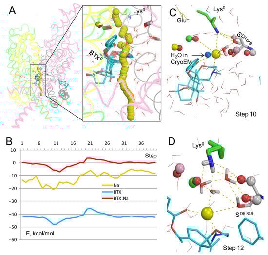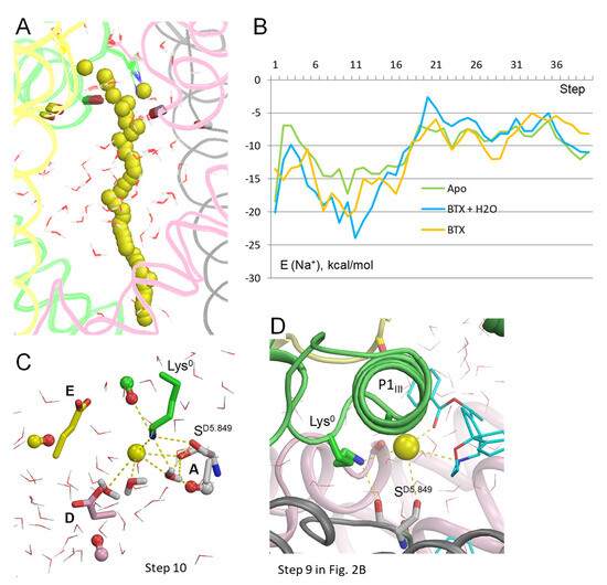 Na+ trajectory in the model without BTX (Figure 4A,B) is rather similar to the models with Lys0/BTX0. The Na+ energy has a sharp minimum at step 10 due to favorable contacts with three water molecules, SD5.849 and Lys0 (Figure 4C). However, this minimum is considerably shallower than analogous minima in models with BTX0/Lys0 and BTX0/Lys0/cryoEM-H2O. In all three models, Na+ at steps 5–17 is stabilized by the above-described contacts, as well as by macrodipoles in P1 helices [32], specifically, with helix P1III in this channel (Figure 4D).