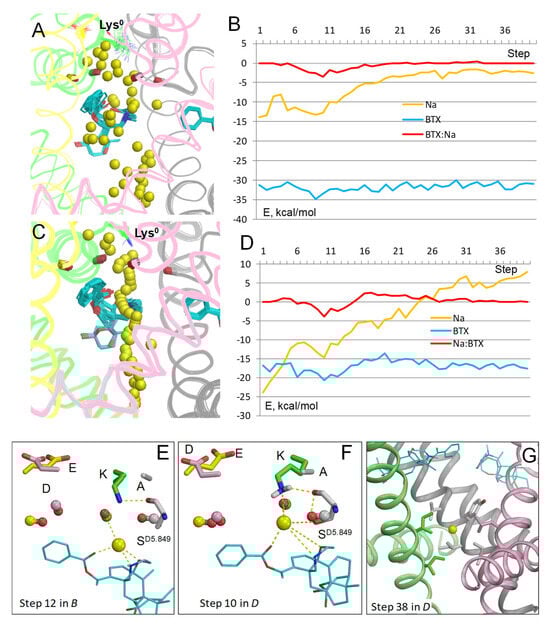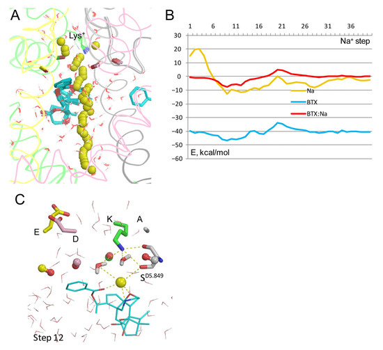 The energy profile of Na+ in the model with Lys+/BTX0 has a maximum at steps 2–3 due to electrostatic repulsion from Lys+ whose sidechain was pinned to the experimental position (Figure 6A,B). Energy of Na+ is negative at steps 7–17, but the wide energy minimum at these steps is shallower than analogous minima in models with BTX0/Lys0 (Figure 4B). In step 12, Na+ was chelated by three electronegative atoms of BTX0, two water molecules, and the backbone carbonyl of SD5.849, while Lys+ donated H-bonds to the backbone and sidechain oxygens of SD5.849 and two water molecules (Figure 6C). The energy barrier of Na+: BTX0 interactions at step 20 is higher than that in models with Lys0/BTX0 (Figure 4B).