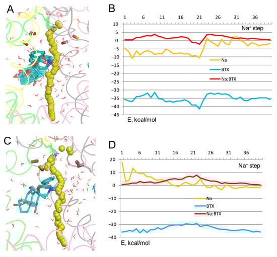 In the model with BTX+/Lys0, Na+ experienced repulsion from BTX+ all along the trajectory, except for steps 19–22 where the BTX+: Na+ energy was weakly negative due to nonbonded attraction of Na+ by the toxin (Figure 7A,B). However, Na+ has a negative energy at steps 1–20 due to its favorable hydration. And unlike in models with BTX0/Lys0 (Figure 4B), the Na+ energy beyond step 23 fluctuated around zero and had small positive values despite the presence of explicit waters. Thus, while Na+ could permeate through the pore with bound BTX+, this model cannot explain how BTX could affect the ion selectivity of the channel. It should be noted that at high concentrations the quaternary analog of BTX behaves as the agonist [35].