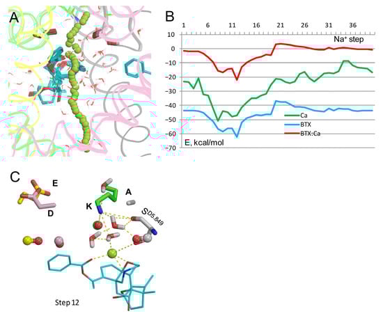 In the model with BTX0/Lys0, Na+ closely approached BTX (Figure 2A). The energy of Na+ is minimal at steps 8 to 14 (Figure 2B) due to attraction to electronegative atoms of BTX. Position of Na+ at step 10 is very close to that of the water molecule in the cryoEM structure 8t6l (Figure 2C). At this step, Na+ is equidistant (~3 Å) from the nitrogen atoms in BTX0 and Lys0 and it favorably interacts with three electronegative atoms of BTX, two water molecules, sidechains of Lys0 and SD5.849, and the backbone carbonyls of TC5.848 and SD5.849. At step 12, Na+ is chelated by three electronegative atoms of BTX0 and favorably interacts with a water molecule and the sidechain of SD5.849 (Figure 2D). It should be noted that since the entropy is not computed, the energy profiles reflect enthalpy rather than free energy. Due to this limitation the Na+ energy is negative all along the inner pore, in spite of the cryoEM structure 8t6l capturing the channel in an impermeable inactivated state. The energy is maximal at steps 33–35 around the activation gate. Another maximum of Na+ energy is seen at step 21, where energies of BTX0 and BTX0: Na+ interactions are also maximal (Figure 2B). Importantly, stabilization of Na+ by BTX0 and related stabilization of the dunked conformation of Lys0 (Figure 2C,D) may explain why BTX dramatically increases calcium permeability [8], as discussed in a later section.