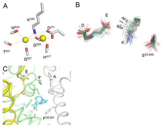 An important evidence that deprotonated lysine may interact with a Na+ ion is seen in the high-resolution X-ray structure of aminopeptidase from endoplasmic reticulum (6ryf) where two Na+ ions bind to a lysine residue [46]. One Na+ ion is chelated between the lysine and an aspartate (Figure 10A), similarly to the model where a Na+ ion displaces a proton from the uplifted Lys+ and binds between Lys0 and Glu− [29].