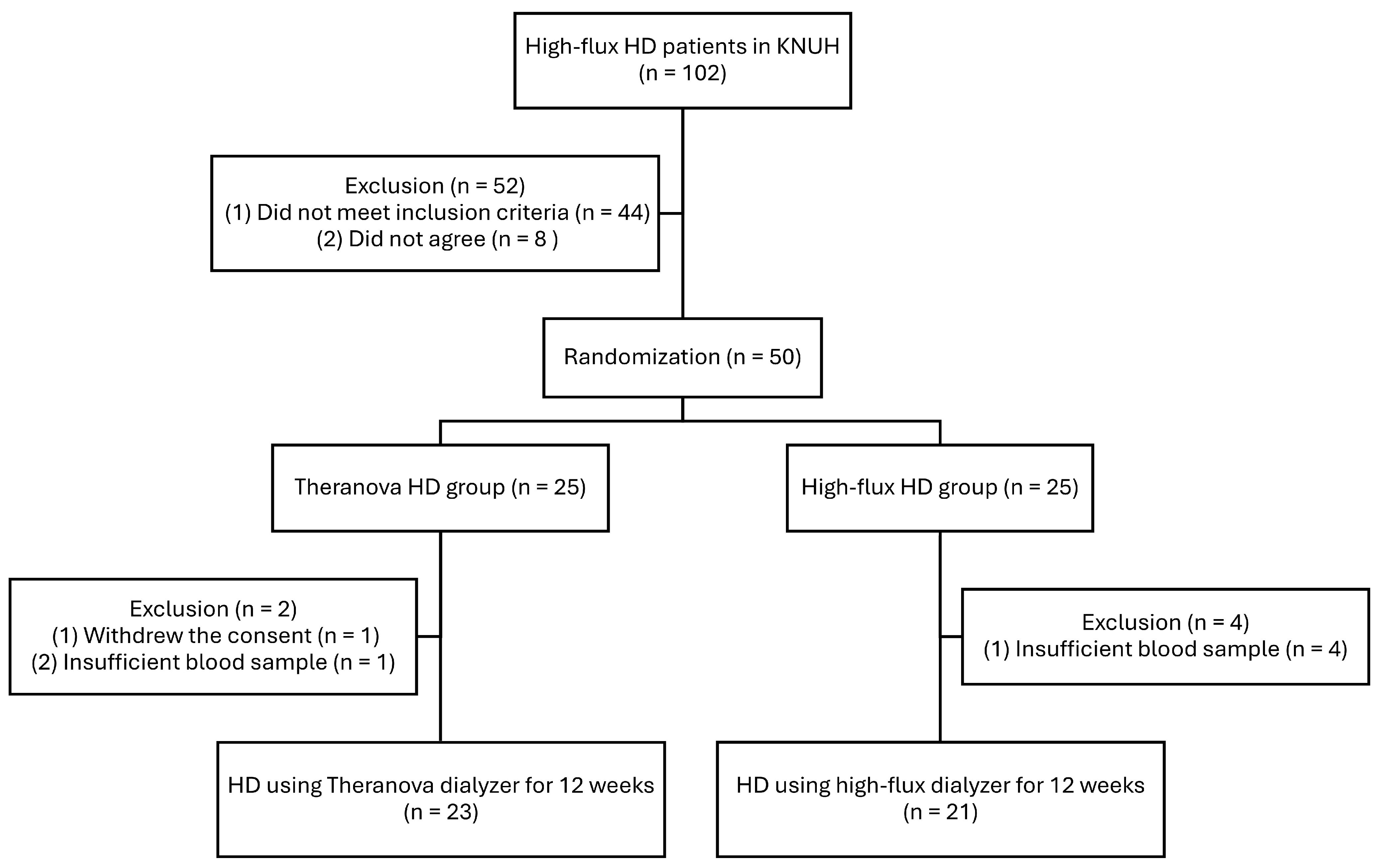 - Lim, J.H.; Seo, Y.J.; Jeon, Y.; Jeon, Y.H.; Jung, H.Y.; Choi, J.Y.; Park, S.H.; Kim, C.D.; Kang, S.H.; Ryu, J.H.; et al. Expanded Hemodialysis with Theranova Dialyzer and Residual Kidney Function in Patients Starting Long-Term Hemodialysis: A Randomized Controlled Trial. J. Am. Soc. Nephrol. 2025, 36, 1614–1625. [Google Scholar] [CrossRef] [PubMed]
