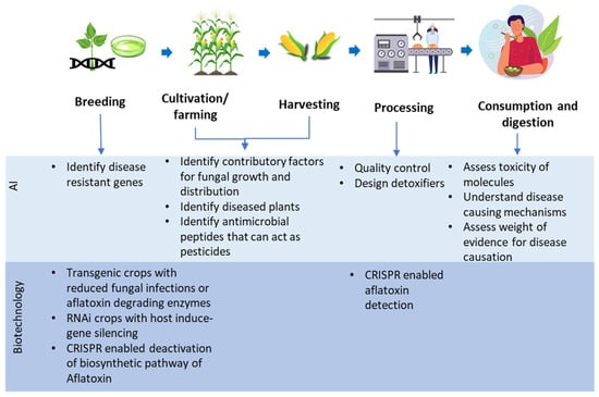 The remainder of this paper describes how AI and biotechnology can be used to improve aflatoxin detection and control, from seed production to understanding of its toxicology. Figure 1 summarizes how AI could improve methods of aflatoxin control from farm to fork, and beyond to human health.