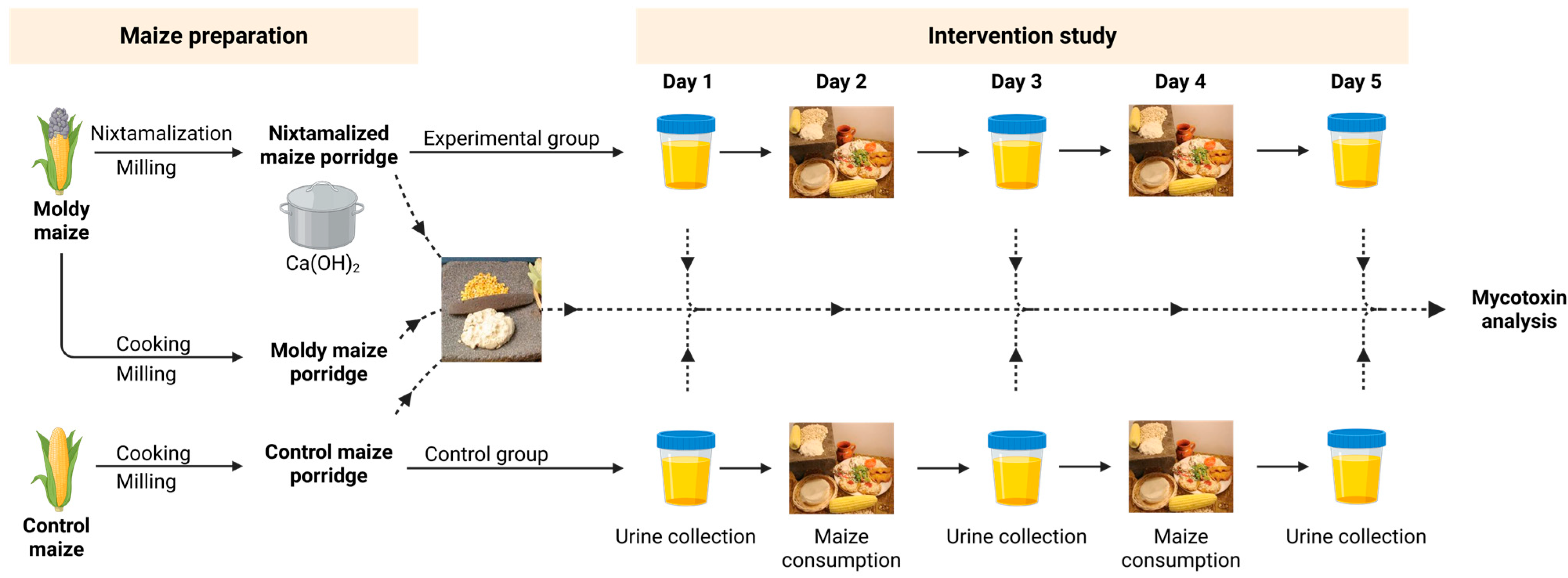 Maris E, Ndlangamandla P, Adelusi OA, Akinmoladun OF, Odukoya JO, Fagbohun RT, Oyeyinka SA, Sekhejane P, Pero-Gascon R, De Boevre M, et al. Nixtamalization of Maize to Reduce Mycotoxin Exposure: A Human Biomonitoring Intervention Study in Soweto, South Africa. Toxins. 2025; 17(11):527. https://doi.org/10.3390/toxins17110527