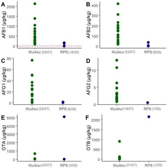 Concentrations of AFB1 (A), AFB2 (B), AFG1 (C), AFG2 (D), OTA (E) and OTB (F) in samples of marketed kluiklui and roasted peanut snacks (RPS). Only samples above LOQ are shown. LOQ values are 0.2 µg/kg for AFB1, AFB2, AFG1, AFG2, and 0.5 µg/kg for OTA and OTB. The total number of samples was 27 for kluiklui and 25 for roasted peanut snacks. The number of samples above the LOQ among the total number of samples is mentioned in brackets. In Graph A, the red dotted line represents the AFB1 limit of 2 µg/kg for peanut-based foods, as established by the European Commission (EC) [36].