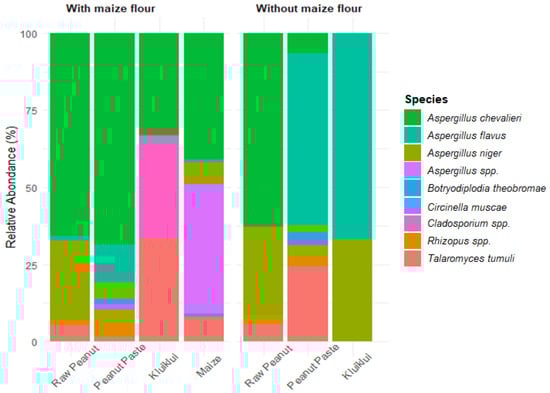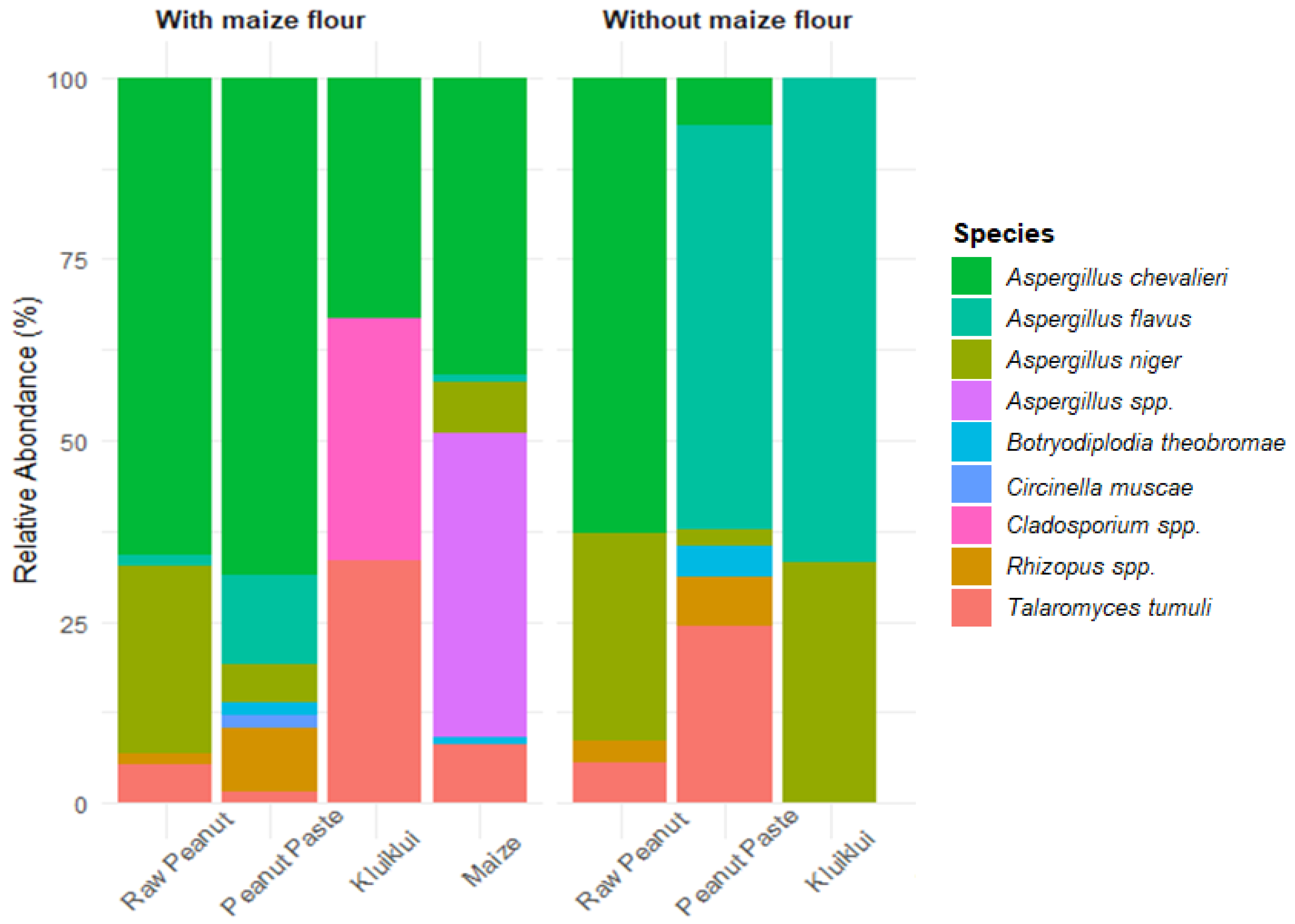 Several fungal species were isolated from samples from kluiklui processing (Figure 2). These included Aspergillus chevalieri, A. flavus, Aspergillus niger, Aspergillus spp., Botryodiplodia theobromae, Circinella muscae, Cladosporium spp., Rhizopus spp., and Talaromyces tumuli. In raw peanut samples, A. chevalieri was the most dominant species, followed by A. niger. For samples from the process without maize flour, A. flavus predominated in both peanut paste and kluiklui; T. tumuli was the second most common species in peanut paste, whereas A. niger was the second most prevalent in kluiklui. In contrast, peanut paste and kluiklui obtained from the process incorporating maize flour were more heavily contaminated with A. chevalieri, while the maize flour itself was predominantly contaminated with A. chevalieri and Aspergillus spp.